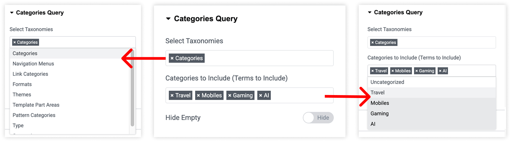 You can select Taxonomies and include categories.
