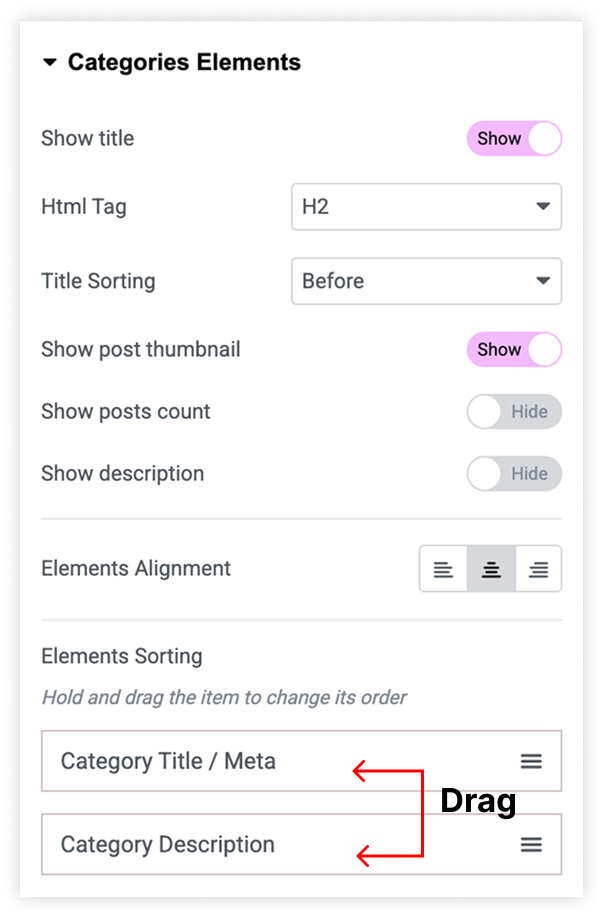 choose which elements to display from Categories Elements and also align elements.
