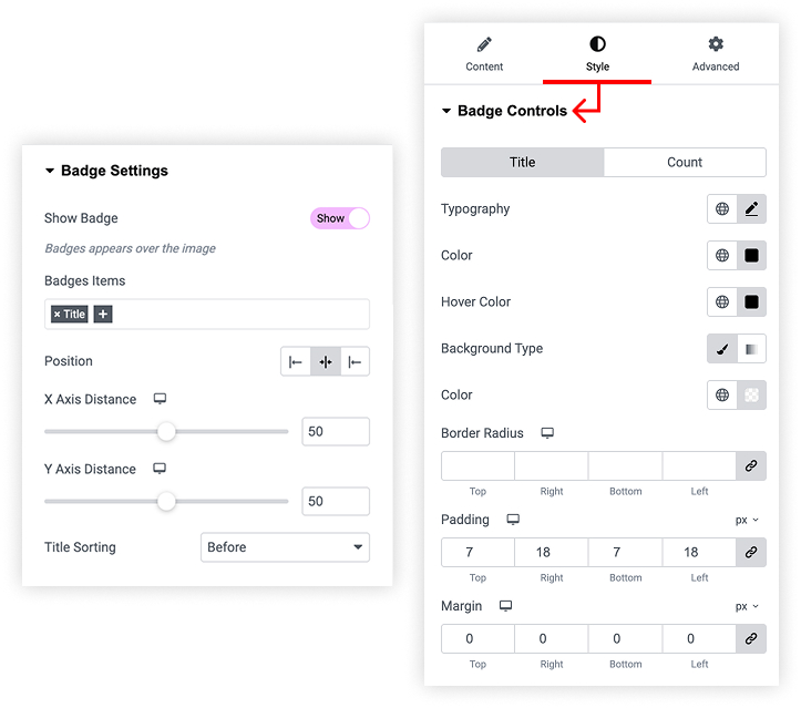 Choose Badge items and change position, distance and title sorting from Badge Settings.