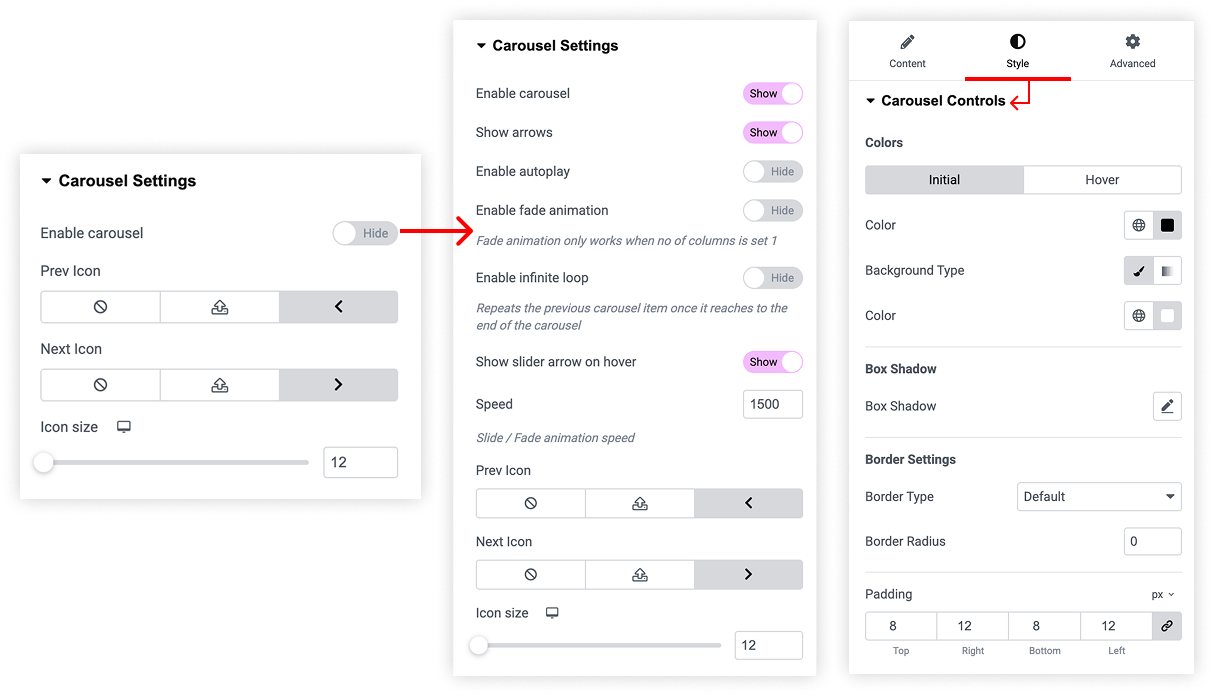 Enable Carousel Settings to hide and show the elements required.