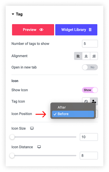 The tag allows users to add number of tags to show,align and adjust size of an icon and distance. Also allows user to set the icon position.